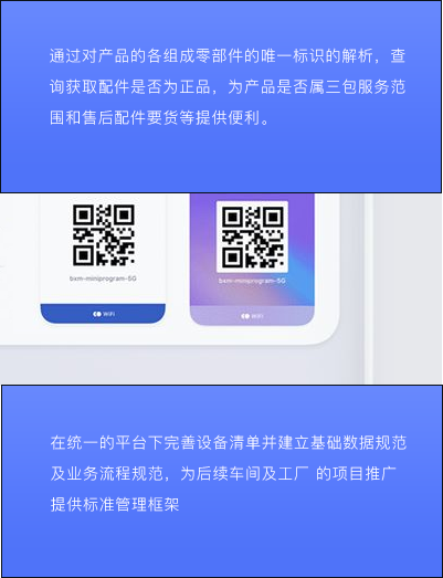通过对产品的各组成零部件的唯一标识的解析,查询获取配件是否为正品,为产品是否属三包服务范围和售后配件要货等提供便利。